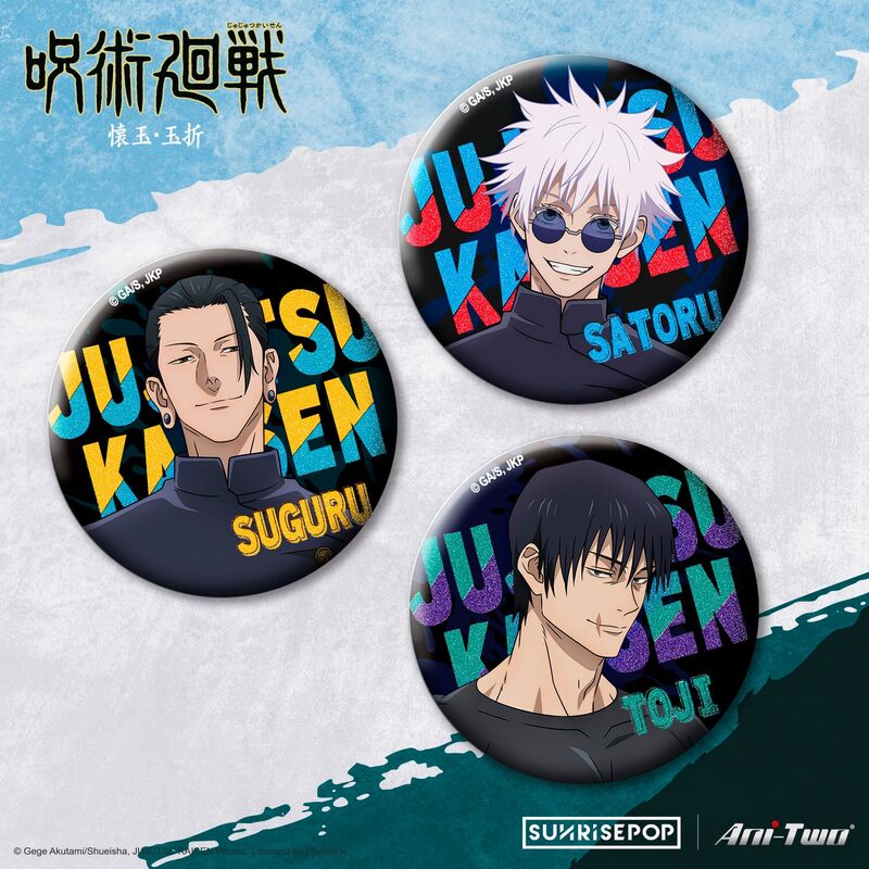 It's the perfect way to collect the three characters, Gojo, Geto and Toji! Each badge features a sparkle effect.