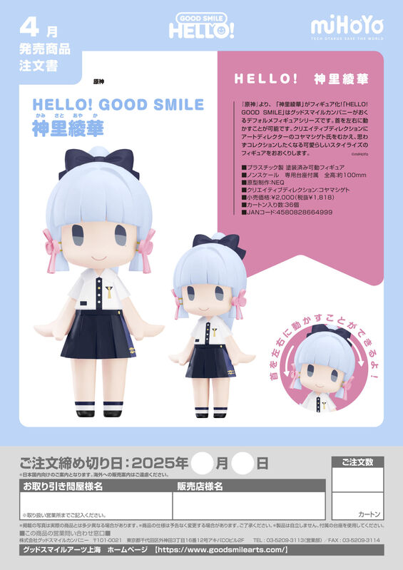 Also available: HELLO! GOOD SMILE Ayato Kamisato Painted plastic non-scale articulated figure with stand included. Approximately 100mm in height.