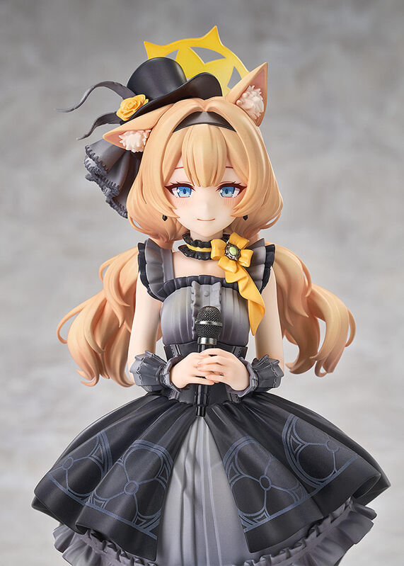From the popular game "Blue Archive" comes a scale figure of Mari, a first-year member of Trinity General School's Sisterhood, in her pop idol outfit! The figure is based on the Memorial Lobby illustration of Mari dressed in her special outfit. Her flowing twintails and ears have been sculpted to the smallest details, and the elegance of her black and grey dress has been brought to life with skillful paintwork. The figure also comes with an interchangeable blushing face part, allowing you to display Mari with a flustered expression! Be sure to add the radiant Mari to your collection! Painted plastic 1/7 scale complete product with stand included. Approximately 240mm in height.