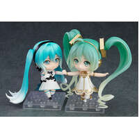 From "Character Vocal Series 01: Hatsune Miku" comes a Nendoroid of Hatsune Miku based off of the main visual from the full orchestra concert "Hatsune Miku Symphony 2020 ~5th Anniversary~". The Nendoroid faithfully captures the beautiful design originally illustrated by Rella. She comes with two face plates including a smiling expression and an expression with closed eyes.
